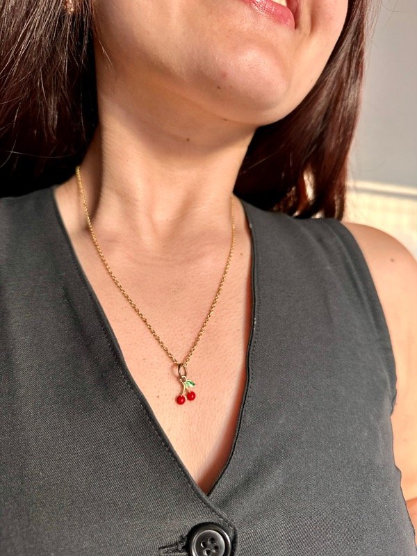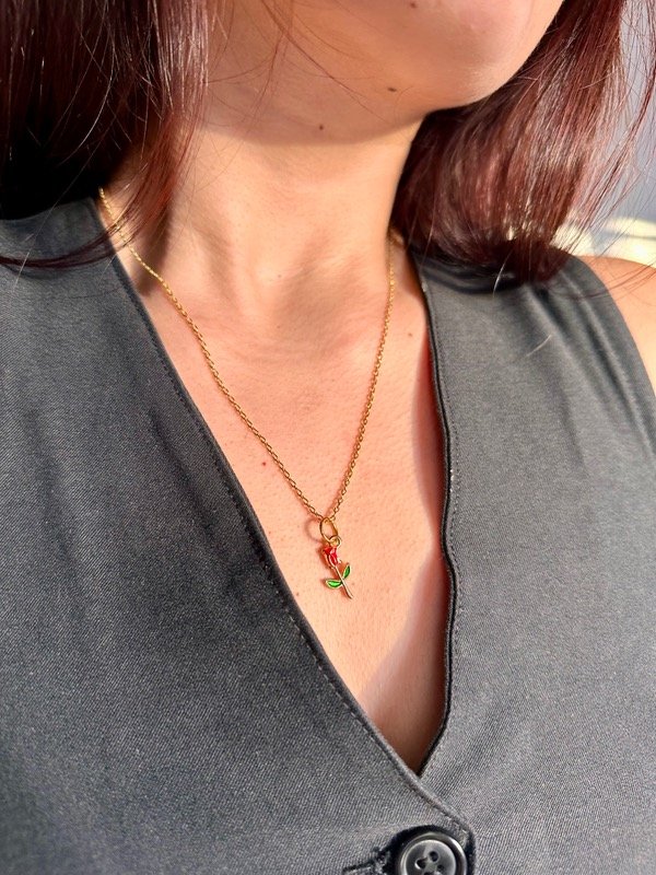 la cadena es de acero dorado y el dije de fantasía ❤️